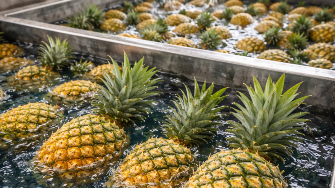 Post-harvest loss of fruits, particularly pineapples are a matter of concern for countries with agriculture-based economies. Therefore, developing and implementing treatment methods to extend the shelf life of pineapples by reducing post-harvest decay and maintaining the physicochemical qualities of the fruit is of prime importance. We aimed to investigate the effects of different post-harvest treatment methods on changes in the physico-chemical and sensory properties of pineapple fruits during storage at room temperature. The experiment comprised three post-harvest treatments: Control (Untreated samples), NaCl solution (immersion in a 10% NaCl solution for 3 min), Citric Acid solution (immersion in a 10 mmol/L citric acid solution for 3 min) and Hot water treatment (immersion in hot water at 54°C for 3 min). The fruits were evaluated for physiological weight loss, decay percentage, total soluble solids, titratable acidity, shelf life and ascorbic acid content every 2 days. Sensory analysis was performed on the 4th day post-treatment. The experiment followed a completely randomised design with three replications. There were significant differences between the control and treated samples. Pineapple fruits treated with hot water exhibited the lowest weight loss (9.2 %) and the lowest decay rate (11.11 %) after 14 days of storage at ambient temperature (25°C ± 3). The maximum shelf life (10.1 days) was observed in fruits treated with hot water, followed by those treated with citric acid (8 days). Although hot water treatment significantly reduced vitamin C content (25.32 mg/100 ml), its effects on sensory attributes were not significant. Principal Component Analysis indicated a positive correlation between NaCl treatment, no treatment, physiological weight loss, and fruit decay rate. Hot water treatment of fresh pineapple fruits can be applied on a large scale as it is low-cost and improves the product’s marketability.